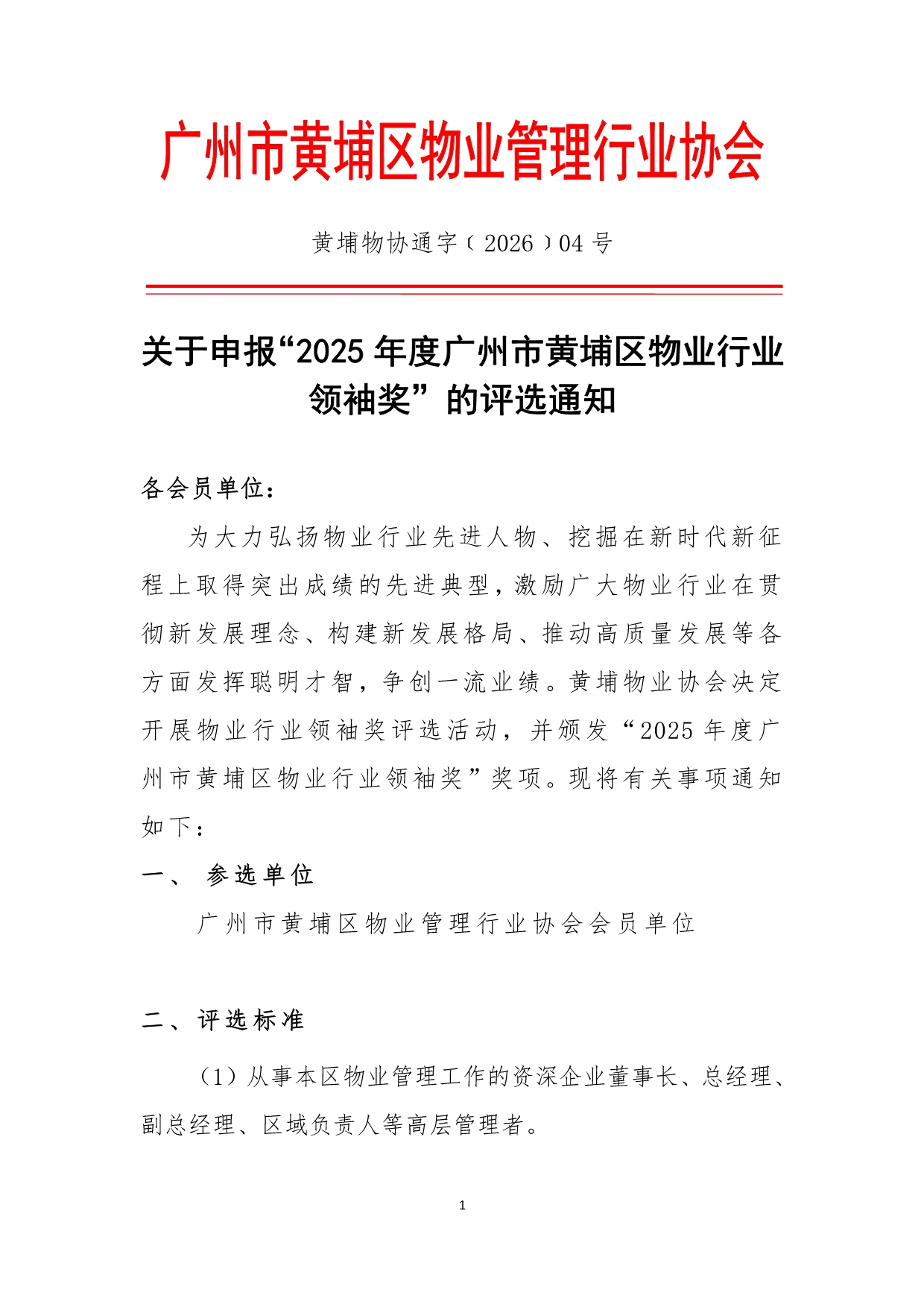 关于申报“2025年度广州市黄埔区物业行业领袖奖”的评选通知