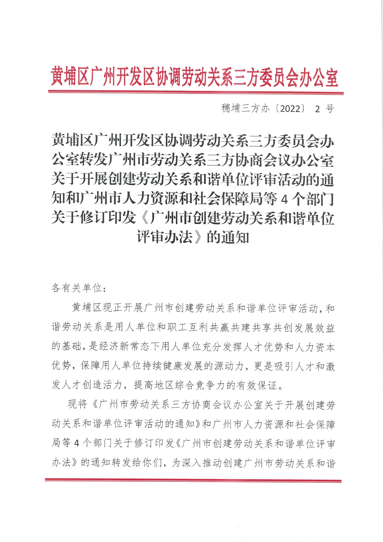 黄埔区广州开发区协调劳动关系三方委员会办 公室转发广州市劳动关系三方协商会议办公室关于开展创建劳动关系和谐单位评审活动的通知和广州市人力资源和社会保障局等4个部门关于修订印发《广州市创建劳动关系和谐单位评审办法》的通知